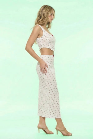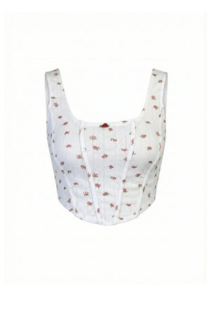 The Amelie Floral Print Tank Top is a vintage-inspired confection crafted from soft, pointelle-striped stretch sprinkled with dainty red rosebuds. Designed with a flattering, corset-style silhouette that dips elegantly at the waist, it captures the romance of traditional corsetry without the restriction of rigid boning. Exposed seam detailing elongates the bodice, while a miniature satin rose sits sweetly at the square neckline. Pair with the matching skirt for a cohesive garden-party look or with worn-in denim for effortless, everyday whimsy.