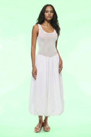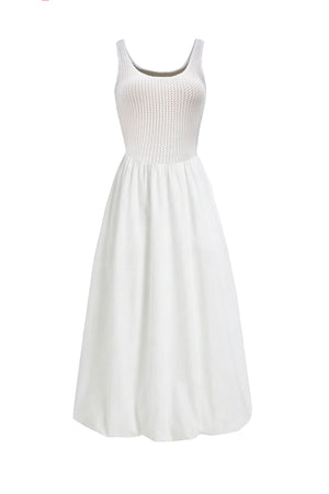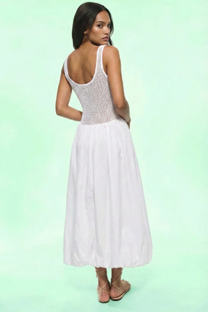 The Seraphina Fabric-Paneled Dress is a study in romantic contrast, marrying a textured, bohemian bodice with a sculptural, voluminous skirt. Crafted from a crisp cotton blend, the form-fitting woven upper bodice features a classic scoop neckline that creates a sleek, vintage-inspired silhouette. The drama unfolds below the waist, where the non-stretch, double-layered skirt is artfully folded back to the waistline, creating a cloud-like bubble effect that floats with every step. Pair with oversized sunglasses and a woven tote for an effortless, high-fashion seaside escape.
