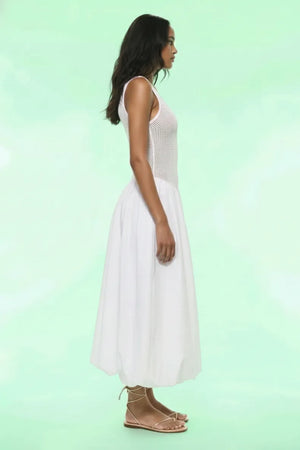 The Seraphina Fabric-Paneled Dress is a study in romantic contrast, marrying a textured, bohemian bodice with a sculptural, voluminous skirt. Crafted from a crisp cotton blend, the form-fitting woven upper bodice features a classic scoop neckline that creates a sleek, vintage-inspired silhouette. The drama unfolds below the waist, where the non-stretch, double-layered skirt is artfully folded back to the waistline, creating a cloud-like bubble effect that floats with every step. Pair with oversized sunglasses and a woven tote for an effortless, high-fashion seaside escape.