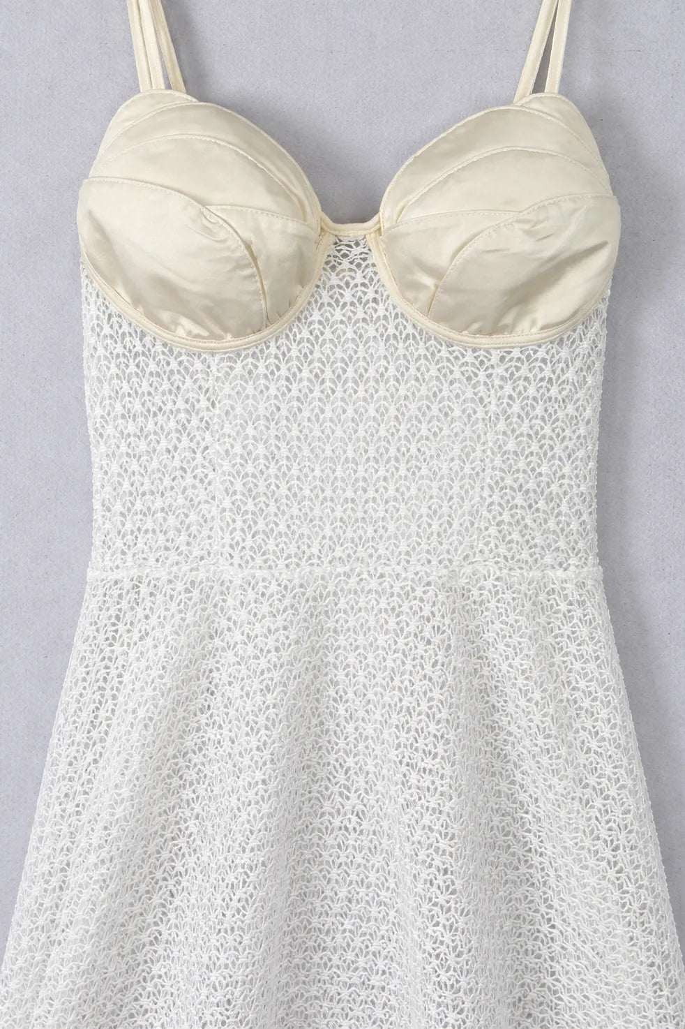 •Intricate paneled texture on the upper bodice